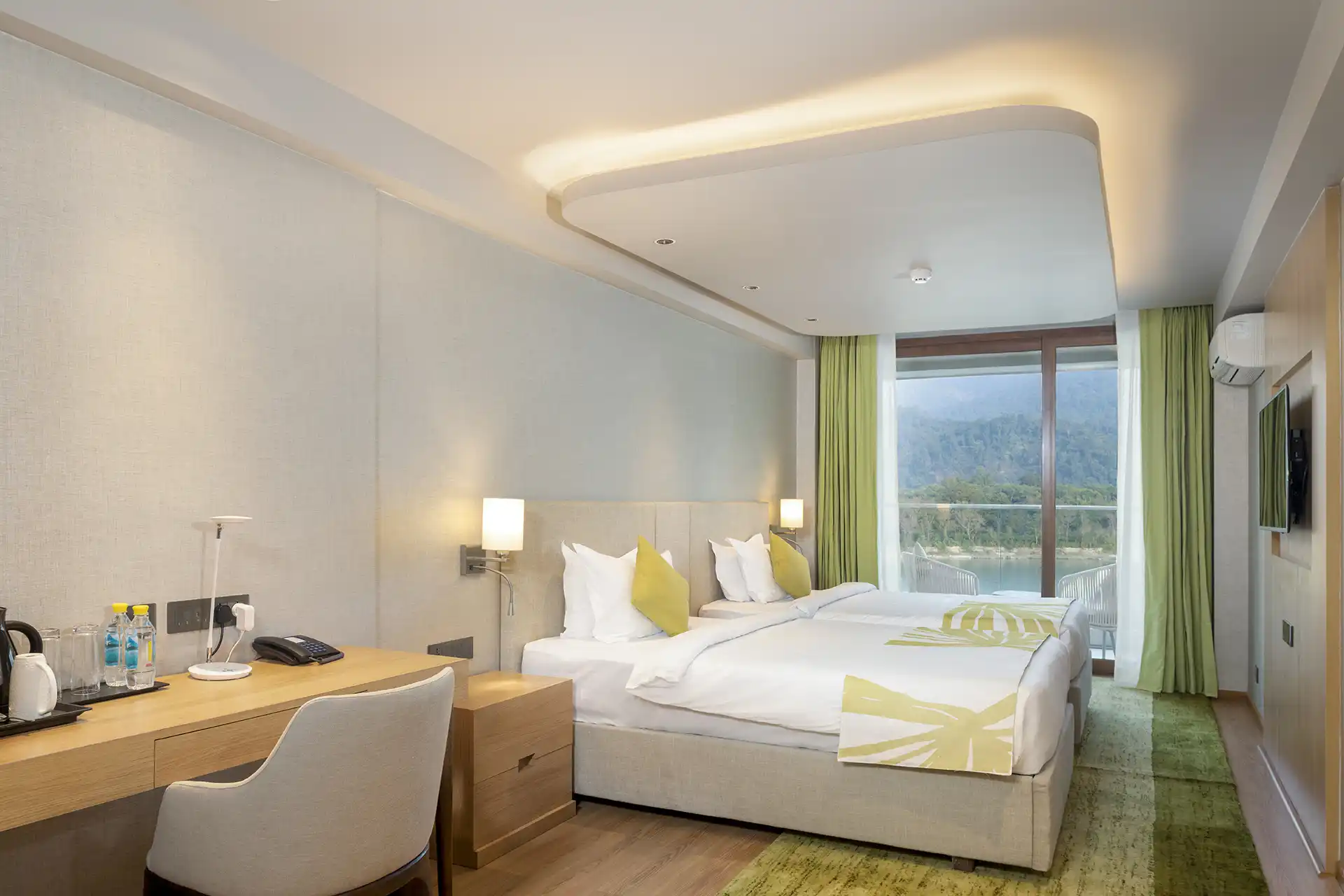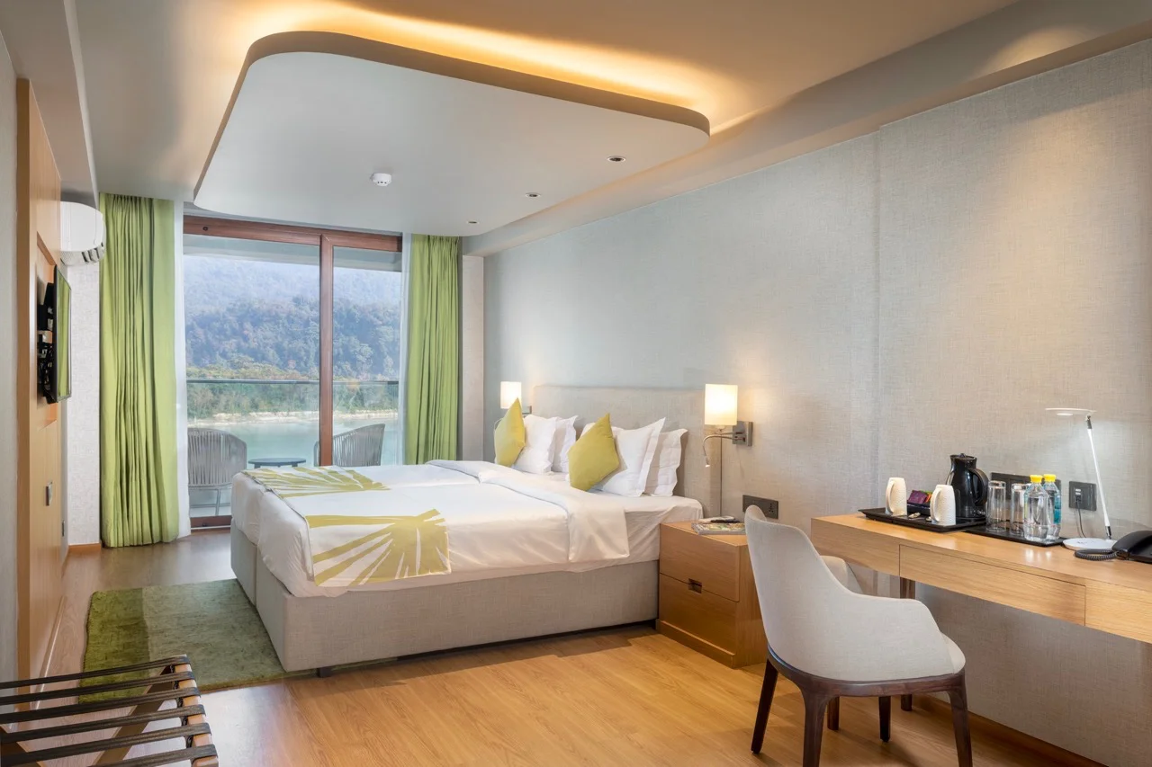 Modi offers more than accommodation;Β it provides an environment that supports both focus and recovery. Spacious, modern rooms, panoramic views, and a calm, natural setting allow the teachings to settle and integrate. The retreat centre includes a swimming pool, sauna, and gym, as well as access to Ayurvedic spa treatments. Practice takes place in a beautiful shala with views over the river, creating a unique space where daily practice and study are held within the landscape of Rishikesh itself.